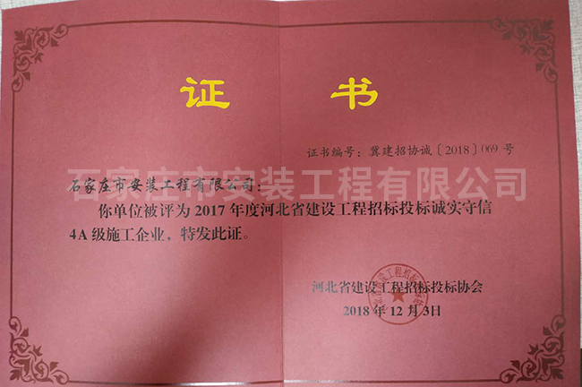 2017年度河北省建設工程招標投標誠實守信4A級施工企業(yè)